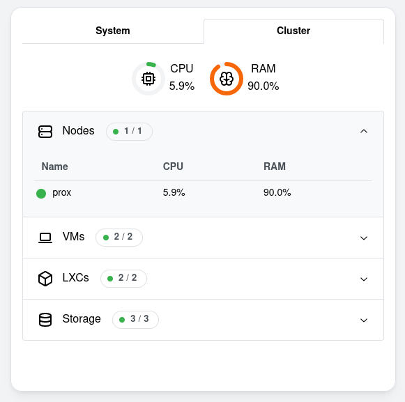The system health monitor widget enables you to integrate with OpenMediaVault and Proxmox. Using the widget, you can view performance and resource data for your systems.