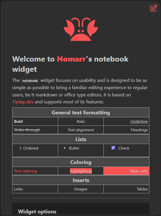 The notebook widget focuses on usability and is designed to be as simple as possible to bring a familiar editing experience to regular users. It is based on Tiptap.dev and supports most of its features.